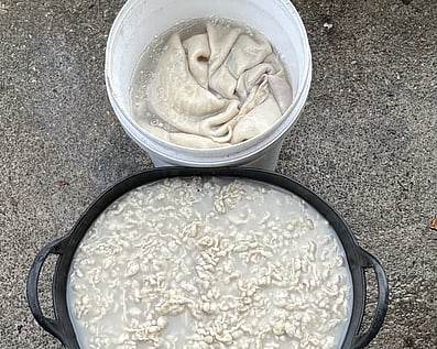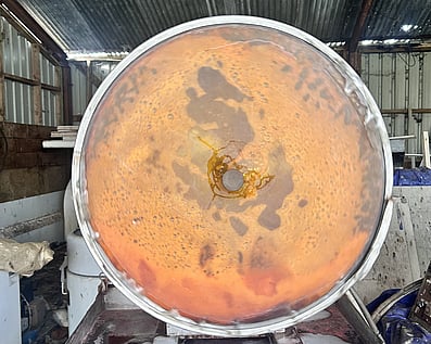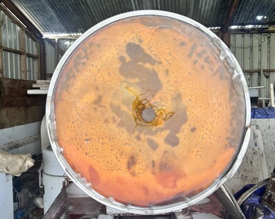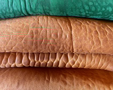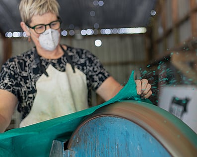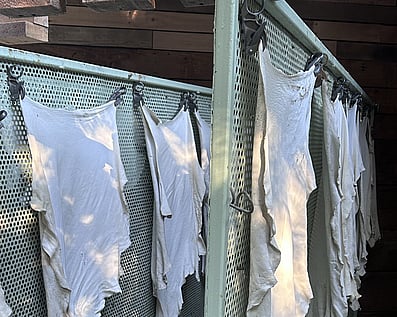 Mill & softenOnce the dyed and dried leather is complete, I can choose to mill the skins.This is a process where the skins tumble in the large drum, time depending the level of softness required.The mechanical action of tumbling is what softens them.
