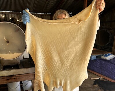 Raw MaterialThe raw material for our leather comes straight off the farm, from our micro-abattoir. It's a short stride across the path into the tannery.