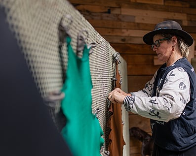 I see Leather as a form of preservation. The process involves fleshing, de-wooling, pickling, tanning and dyeing takes approx. 55 hours, excluding drying time. It's a slow process done single handedly by Carrie.